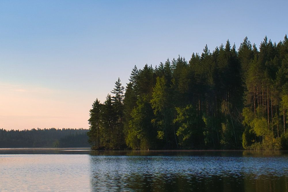 Sunset on a lake in Sweden. The sun is reflected in the calm water. A forest at the edge of the lake completes the romantic picture.