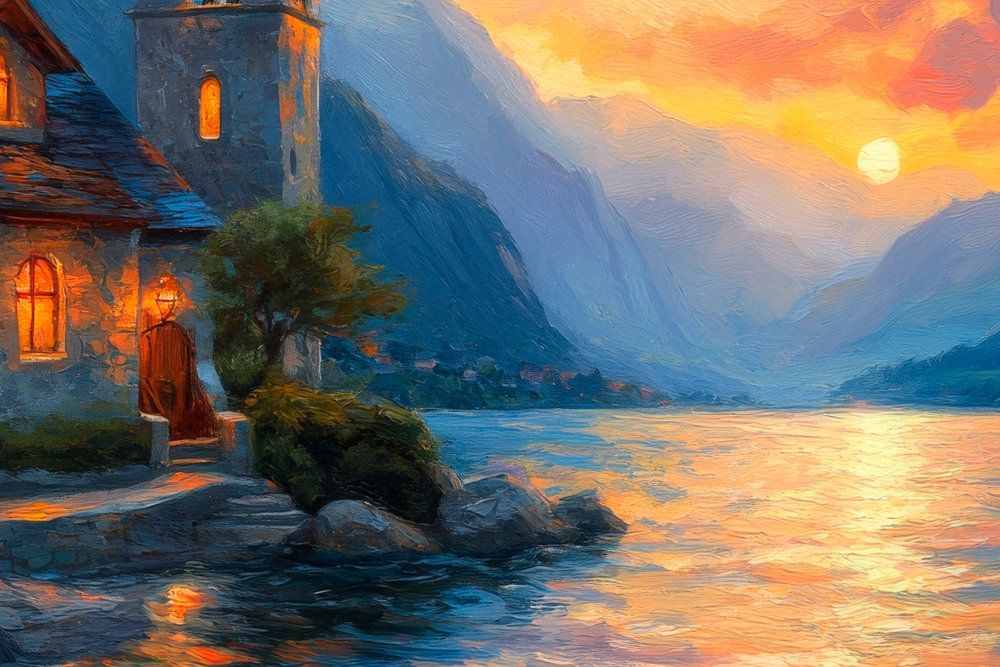 A picturesque refuge on the shore, where the gentle waves of the water reflect the shimmering colours of the sunset. The mystical tower with its charming bell tower rises majestically, while warm light shines through the windows. Surrounded by sublime mountains, the scenery invites you to dream and linger.