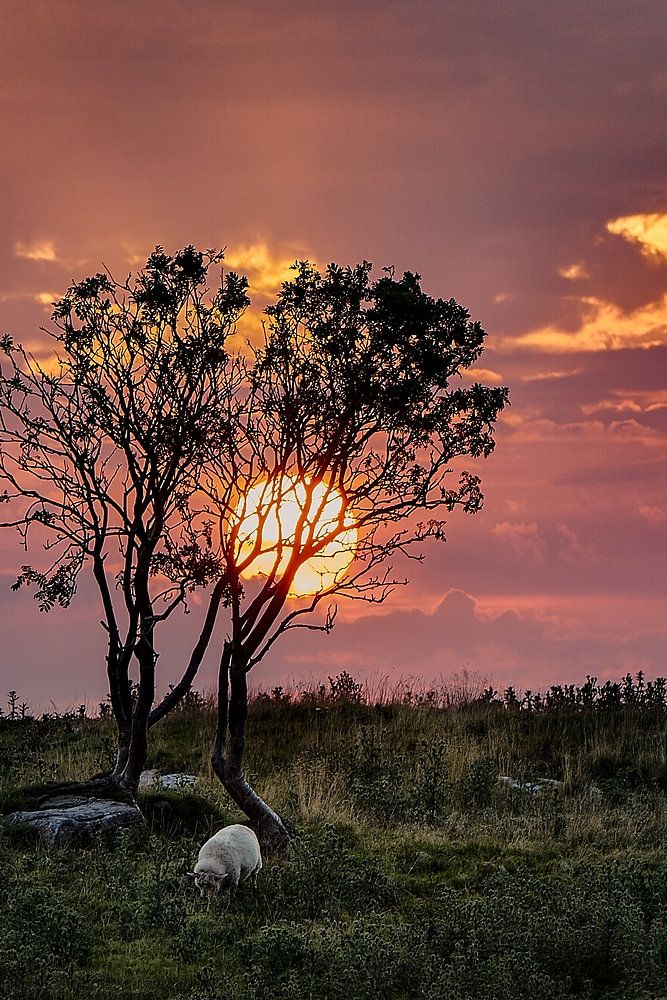 About "Sunset behind a tree with grazing sheep, Vigra, Norway"