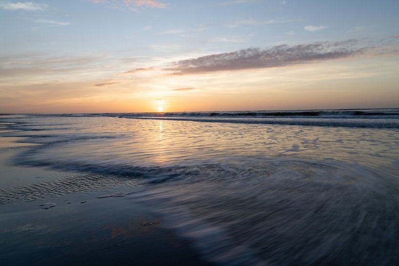 The sun slowly sinks below the horizon as the last warm light glides across the sea, the sky and the wet sand. In the foreground, a wave rolls back towards the ocean, leaving behind beautiful lines, movement and reflections in the water. The combination of soft pastel colours, the gentle rhythm of the surf and the open horizon creates a…