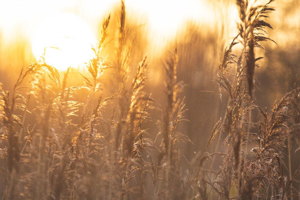Buy this landscape artwork Sunset closeup of blades of grass and reeds by Marjolijn Barten on canvas, ArtFrame, poster and wallpaper, printed on demand in high quality.