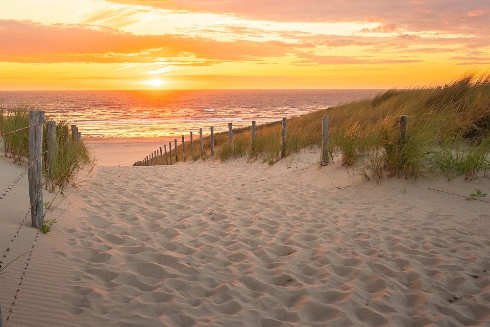 Beautiful sunset from a beach entrance, looking over the beach and sea from dunes.