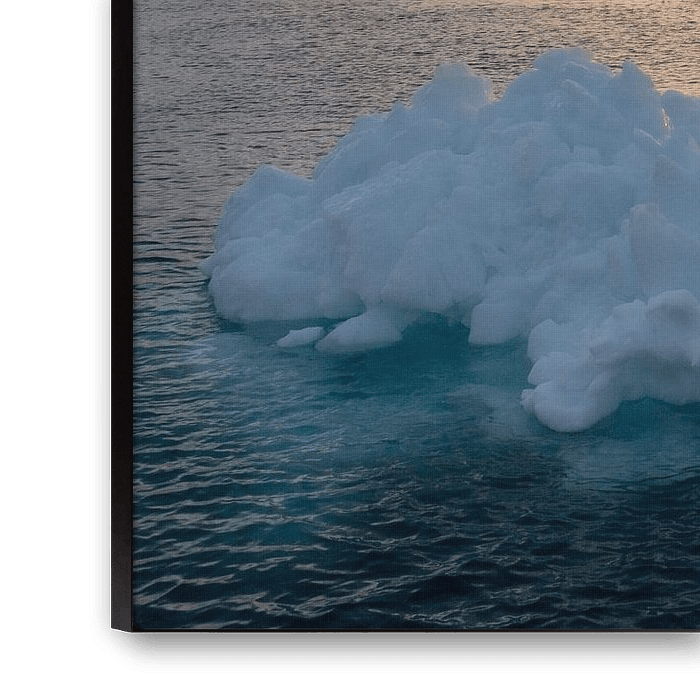 A sailboat with red sails among icebergs in Illulisat Bay in Greenland during sunset in the middle of the night (summer). Threatening black clouds above the sunset.