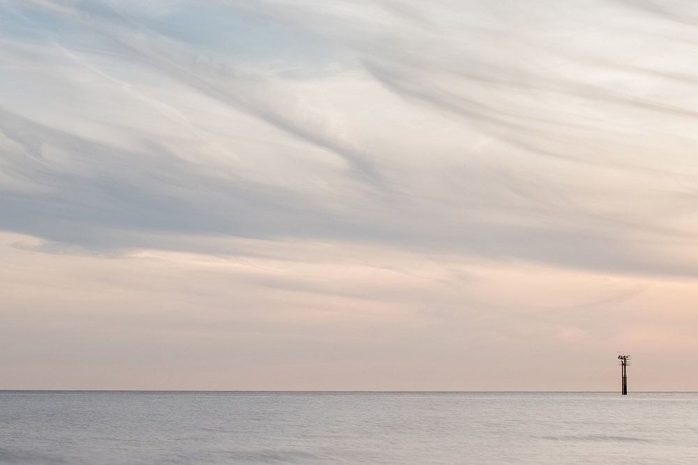 Shortly before sunset, the sky colours into beautiful pastel shades. The veil clouds create interesting textures. The wave runs parallel to the edge of the clouds, creating a balanced image. In the distance