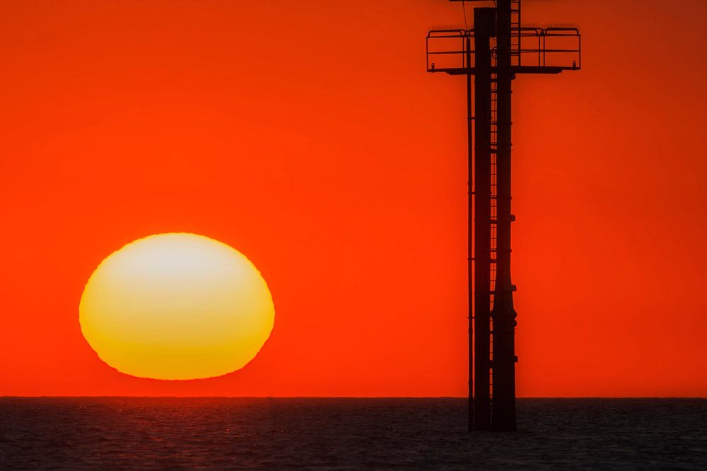 The picture was taken from the beach at the Brouwersdam in Zeeland. Because there is a 600 mm telephoto lens is used, the air is a whole orange/red colored.