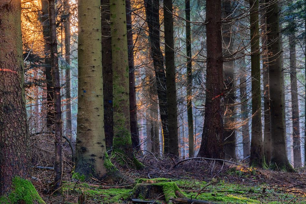 The last light of day shines through the tree trunks of an autumn forest