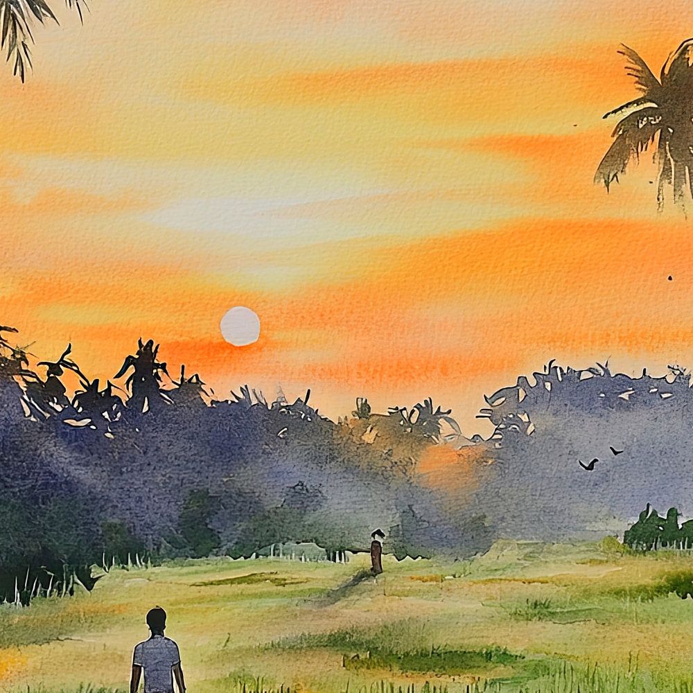Golden rays of sunshine break through the palm groves and bathe the landscape in a warm light. Two hikers lose themselves in the endless expanse of an idyllic field while birds fly over the horizon. This harmonious interplay of nature and tranquillity invites you to dream and discover.