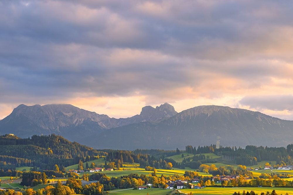 The panoramic format emphasises the vastness and harmony of the Bavarian landscape and captures the peaceful beauty of the Allgäuer Alps, bathed in the gentle warmth of dusk.