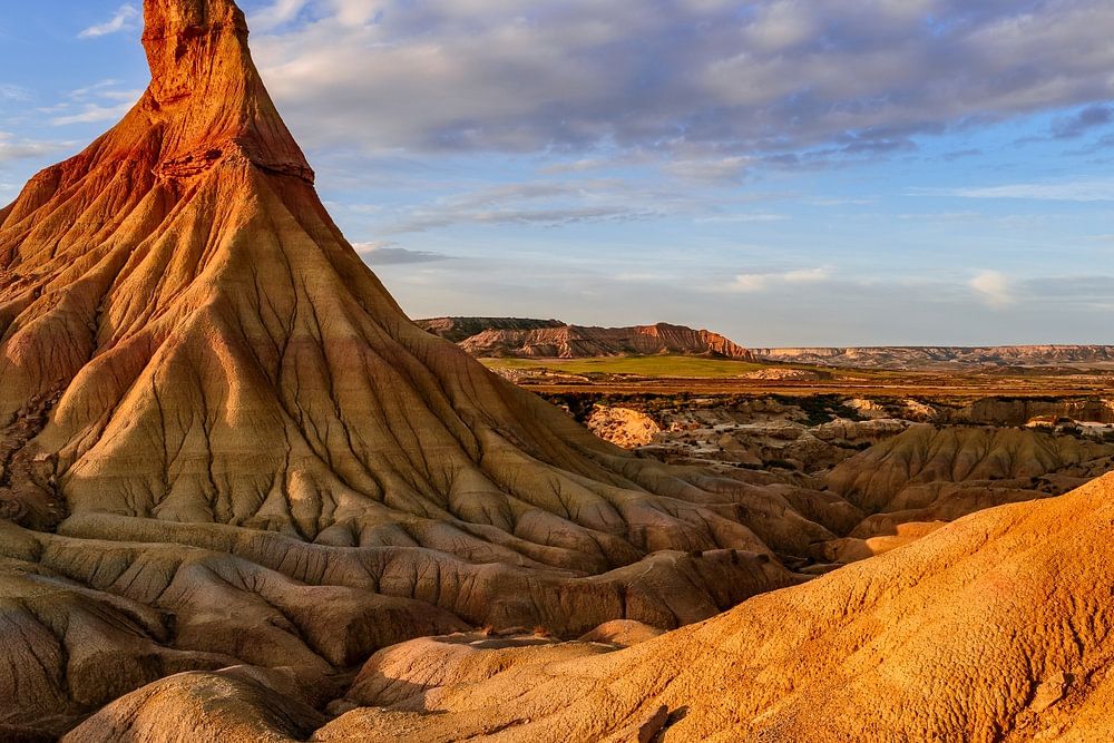 The Castil de Tierra is a spectacular rock formation and the landmark in the Bardena Reales Natural Park in the province of Navarra in northern Spain. When the sun is low in the sky, the individual layers of rock take on an intense colour, giving it a Wild West feel. In autumn and spring, bright colours can be seen almost around the clock in all directions.