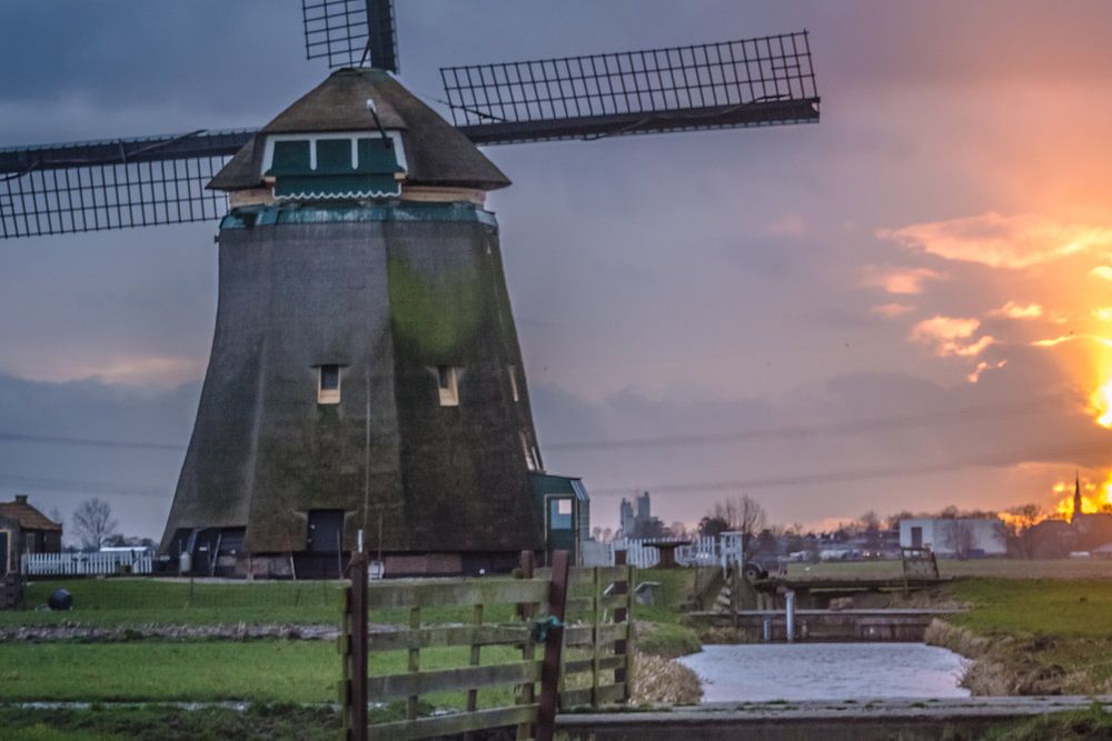 Sunset in the polder of the Groene Hart. The dark clouds hang above the mill, there is rain coming