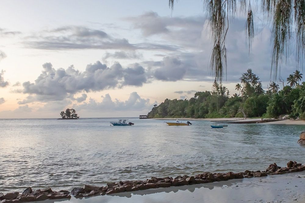 Dreamlike evening atmosphere after a hot day on La Digue. This photo was taken after a wonderful day on the beach at Anse Source d'Argent. The sun is slowly sinking behind Praslin, the second largest island of the Seychelles.