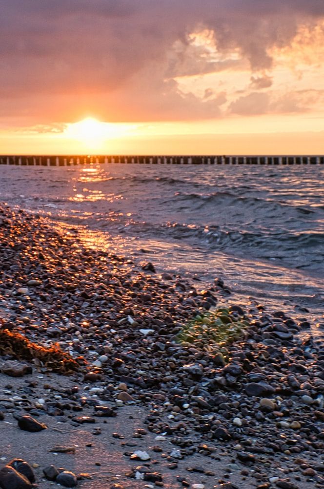 Sunset on the beach at Zingst. Romantic evening atmosphere. Groynes reach into the sea. Landscape shot by the sea