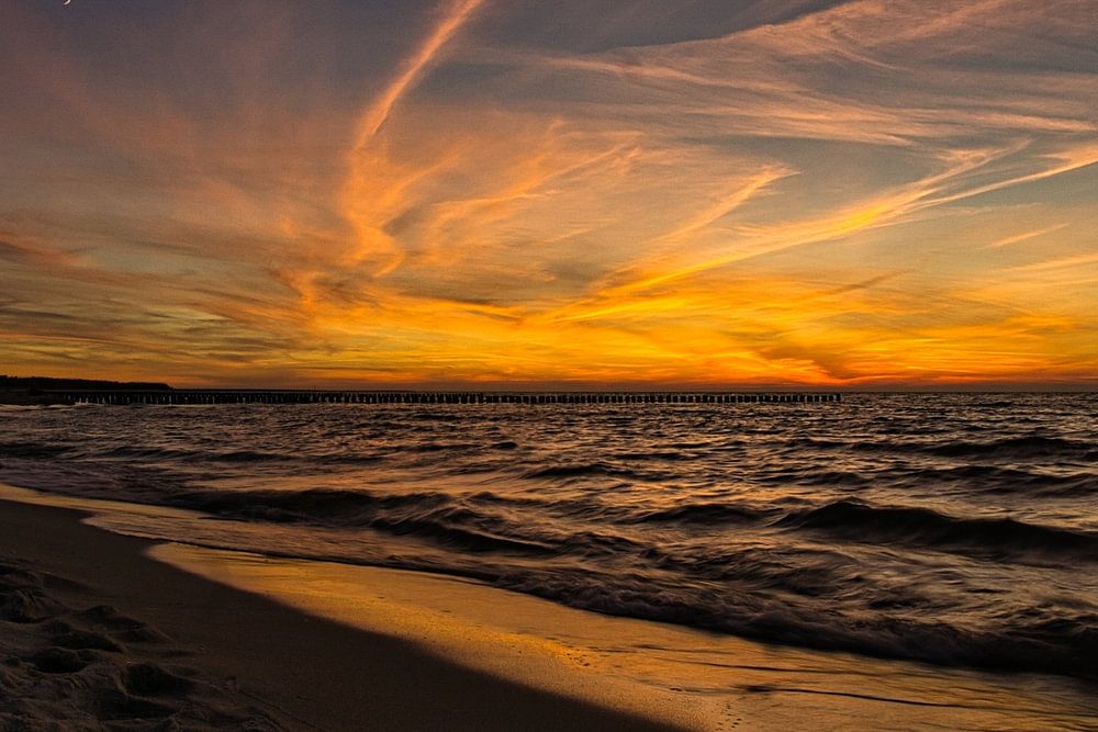 Sunset on the beach at Zingst. Romantic evening atmosphere. Clouds illuminated by the sunlight on the coast. Landscape shot by the sea