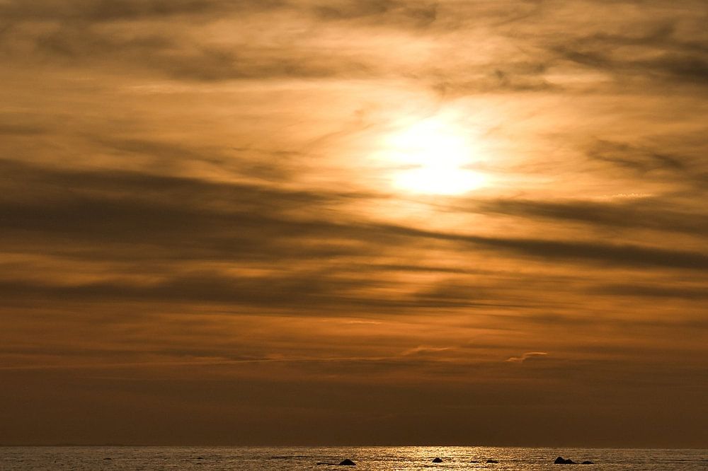 Sunset on the beach at Zingst. Romantic evening atmosphere. Clouds illuminated by the sunlight on the coast. Landscape shot by the sea