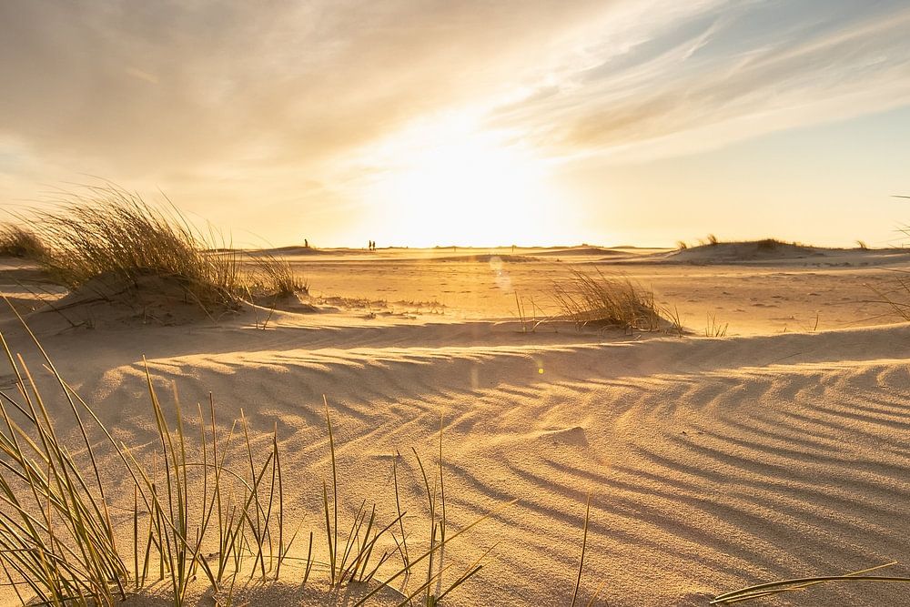 Sunset on the beach of Zeeland during the golden hour. Marram grass, shifting sand and a beautiful cloudy sky just before sunset.