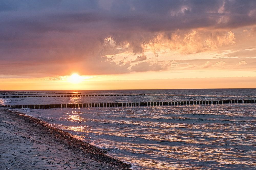 Sunset on the beach of Zingst. Romantic evening atmosphere. Groynes are going into the sea. Landscape shot at the sea