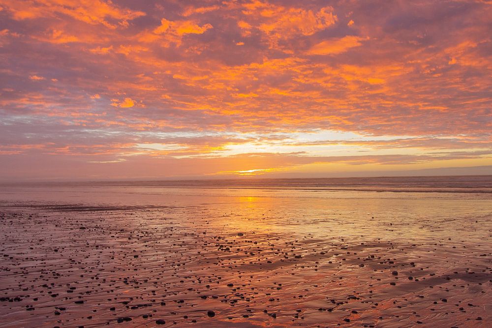 Sunset on the stand while a cloud cover turns orange. The wet beach reflects the colours of the sunset.