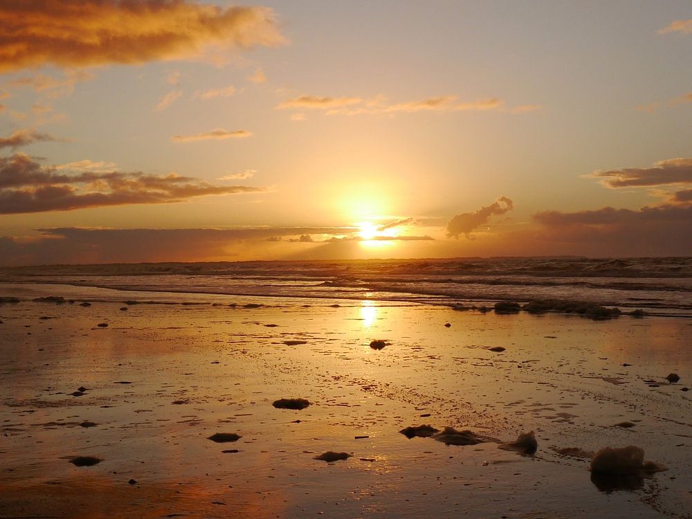 The sun is already low on the North Sea beach. The orange-yellow light not only discolours the clouds, but also the reflection in the water appears in a special shine.