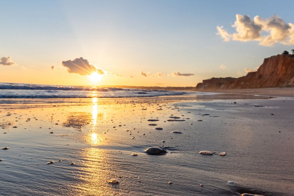 Praia da Falésia, voted the most beautiful beach in the world, is truly unique. Rugged red sand cliffs fading into white, overgrown with colourful flowers. The finest sand on the Atlantic, especially in the evening at sunset. The weather is fantastic in spring, before the start of the season, when the crowds flock to the beach.