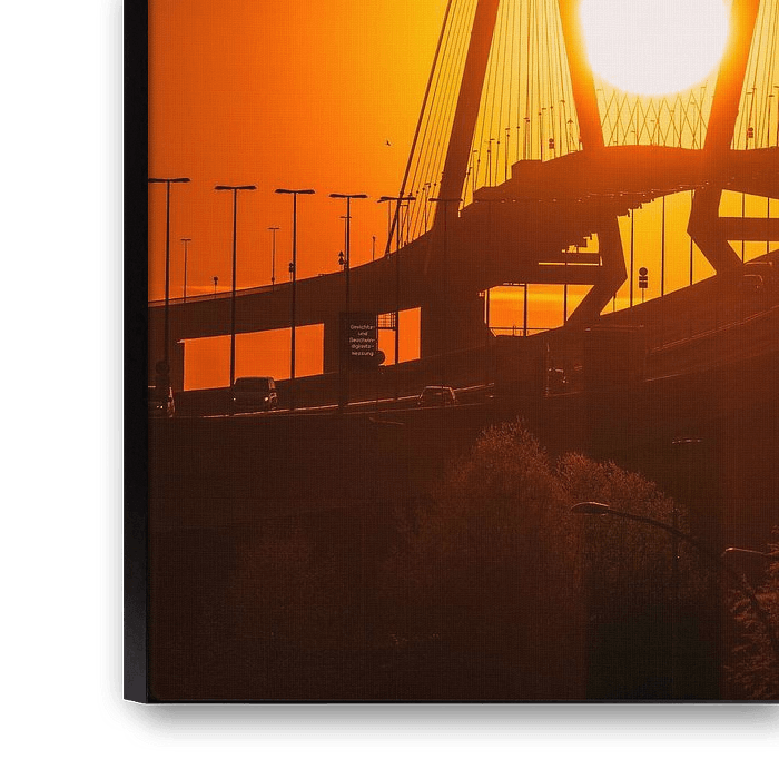 This impressive image captures the Köhlbrand Bridge in Hamburg during a spectacular sunset. The deep, warm colours of the sky - from bright orange to soft yellow and red tones - frame the striking silhouette of the bridge.