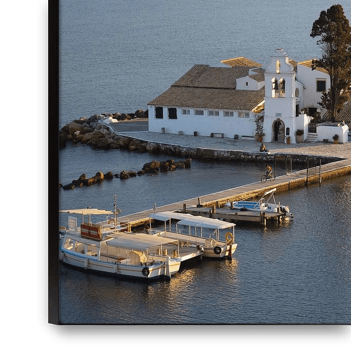 Vlacherna Monastery is an iconic site and one of the most famous and photographed places on the island of Corfu, Greece. The holy monastery of Vlacherna is connected to the mainland by a pedestrian bridge flanked by fishing boats and small ferries that go from the monastery to the famous mouse island (Pontikonisi Island).
