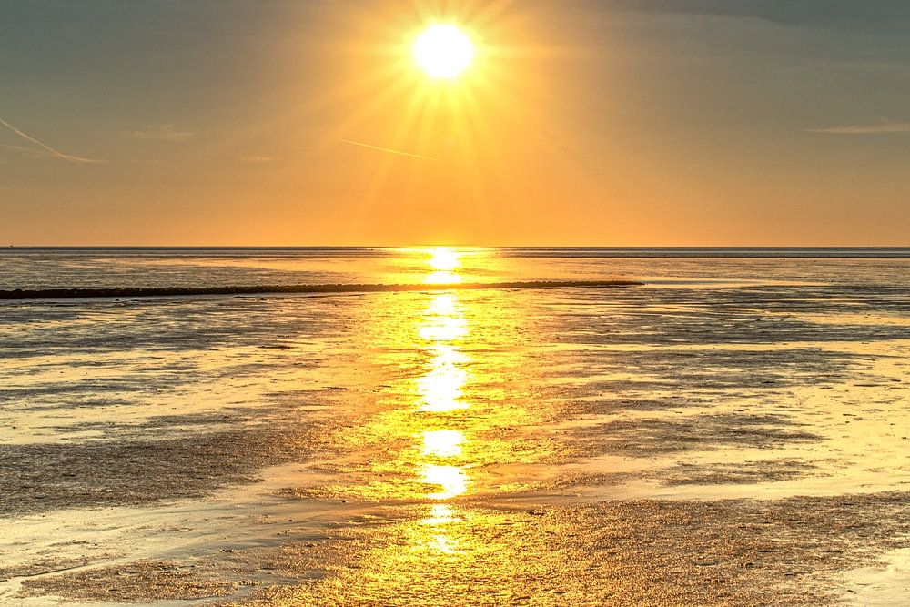 Sunset over The Wadden at low tide with the reflecting sun in the mudflats from the dike near the Frisian village of Koehoal