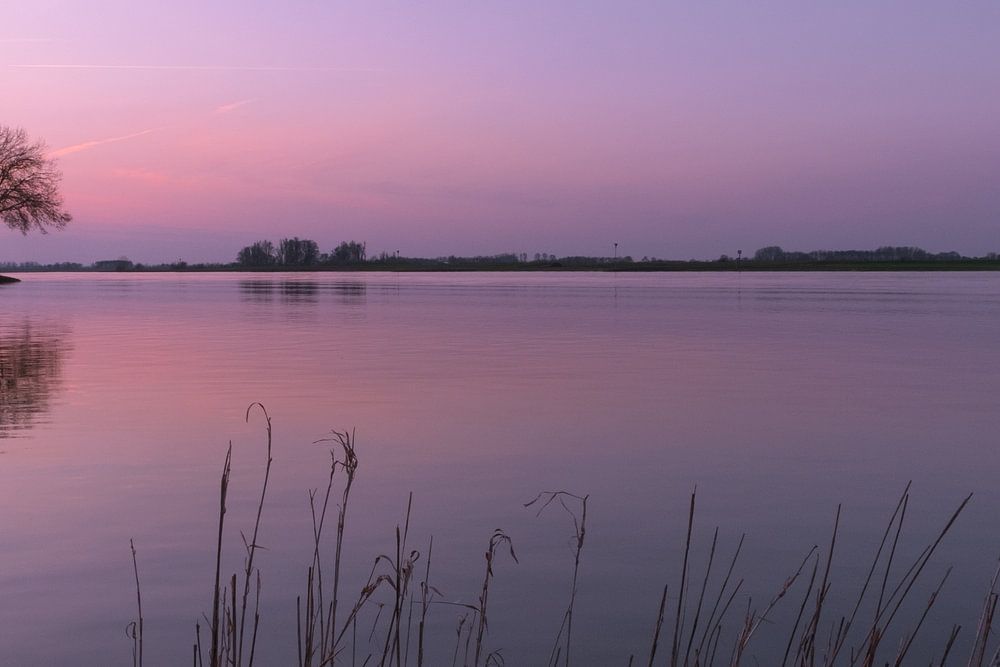 A beautiful Dutch river landscape with a tree on a groyne during a beautiful sunset along the river Lek.