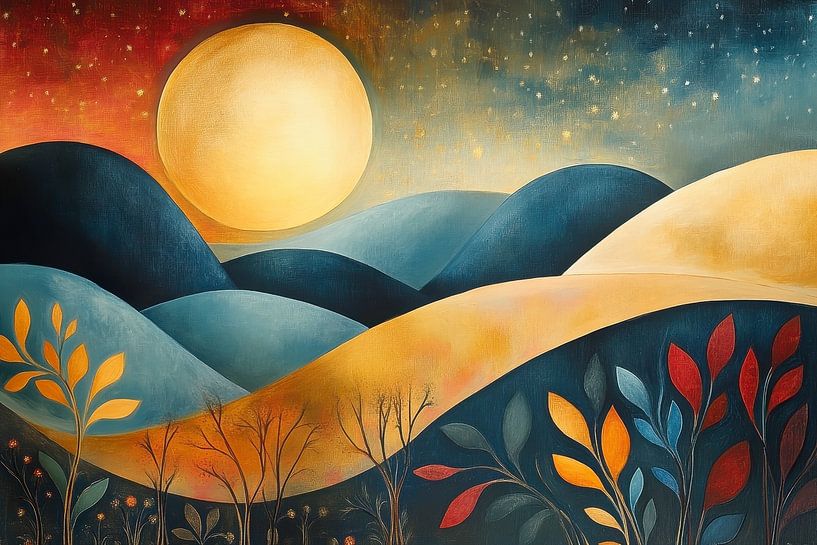 A lively landscape with rolling hills under a radiant, oversized sun, bathed in an interplay of warm and cool colours, shines with a warm glow. The silhouettes of plants and trees stand out in the foreground and form a contrast to the more subtle background. The scene combines natural elements with an abstract, dreamlike appearance.