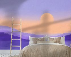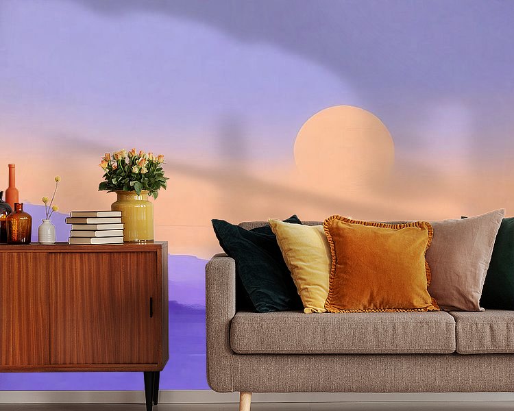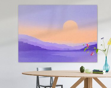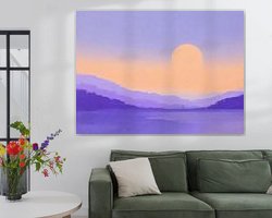 Sunset - This abstract painting shows a soothing colour gradient, from soft purple at the top and bottom to a warm salmon-coloured horizon in which a large, soothing orange sun hangs.