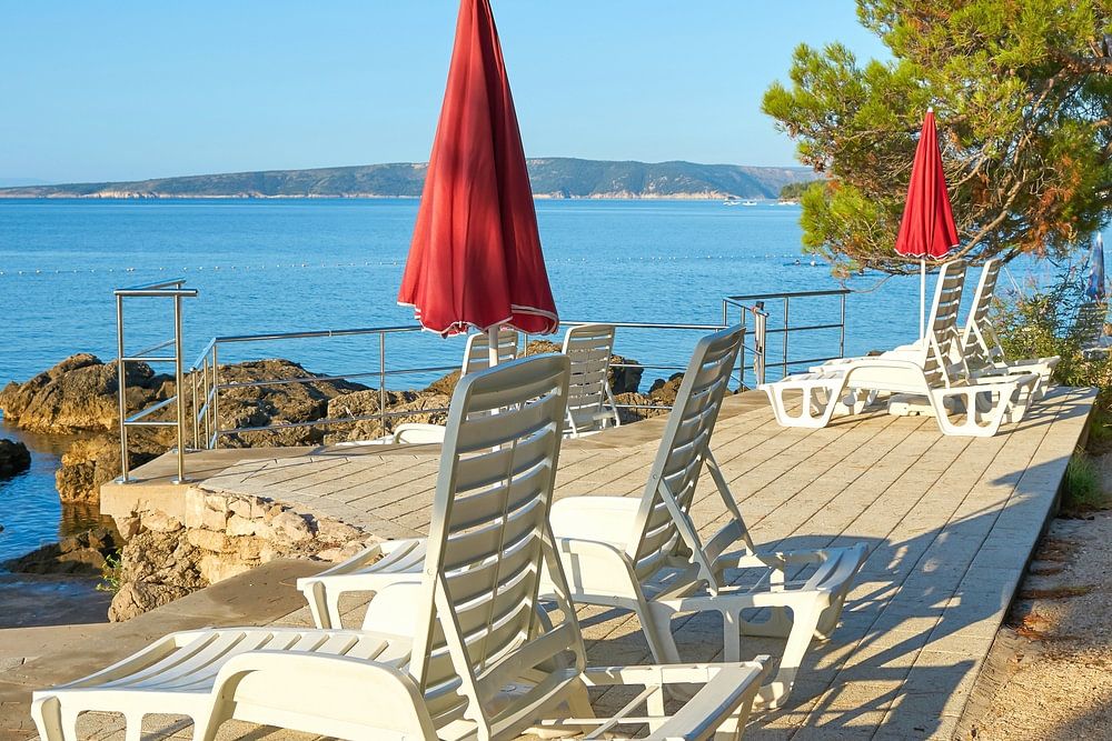 Sunshades and sunbeds at a typical bathing spot on the coast of the town of Krk on the Adriatic Sea in Croatia