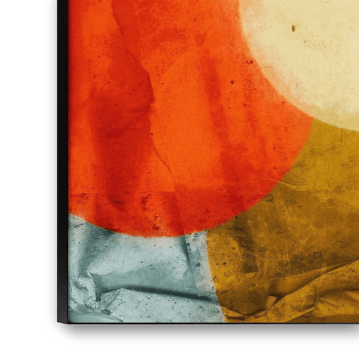 Abstract geometric shapes - circles in warm hues of orange, deep yellow, red and brown - overlap against a muted light blue-gray background. The composition features a textured effect with visible cracks, folds and lines, adding an aged appearance.