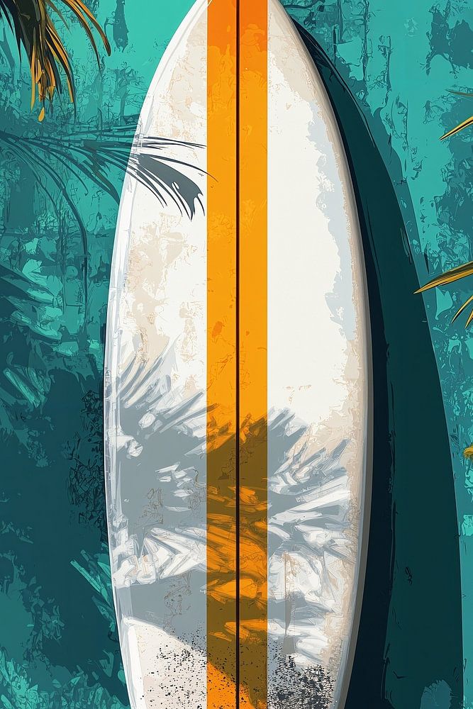 A stylish composition in which a white surfboard with an orange stripe takes center stage against a weathered turquoise wall. Framed by lush palm fronds that cast dramatic shadows, the image creates a perfect balance between urban surf culture and tropical serenity. The play of light and shadow, combined with the warm terracotta floor, gives the whole a modern, artistic look.