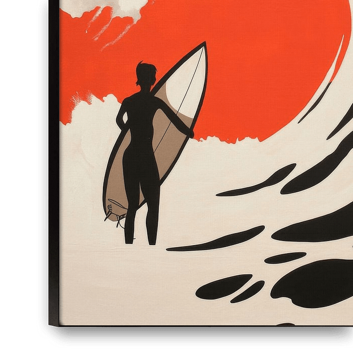 A silhouetted figure with a surfboard stands in the centre of a powerful wave tower illuminated by a glowing orange sky. The dynamic, curved lines of the wave create a sense of movement and adventure, while the contrast between black and white emphasises the intensity and passion of surfing. A moment full of anticipation and challenge.