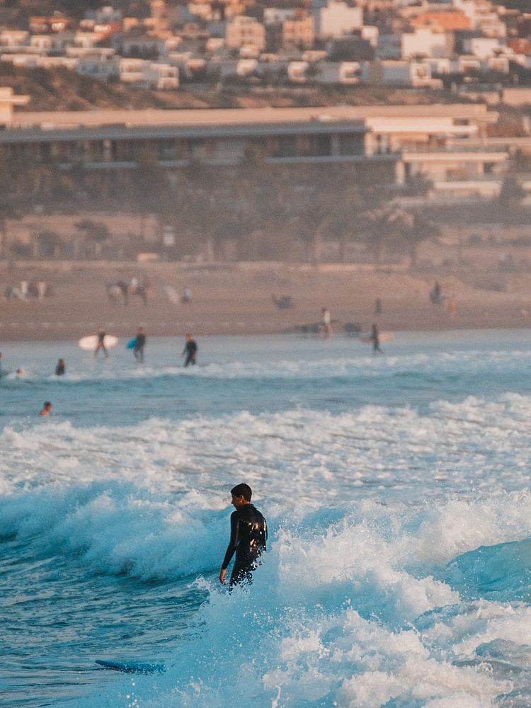 Surfer on a wave in the small town of Taghazout, on the coast of Morocco. Perfect spot for surfing, this is where a lot of people come too.