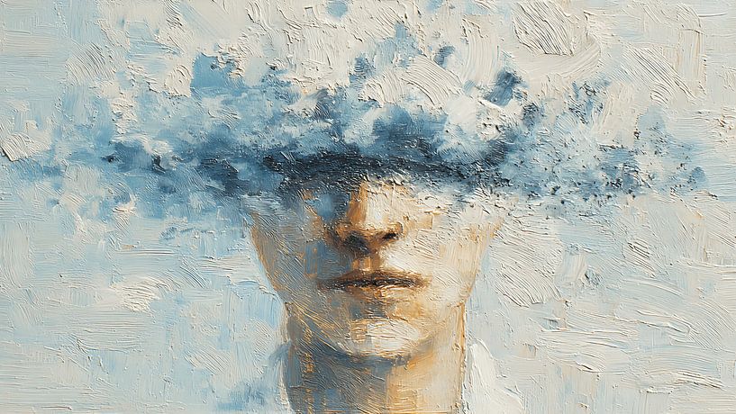 A surreal and thought-provoking artwork depicting a human head expanding into abstract cloud-like forms, symbolizing the dissolution of identity and the limitless nature of the mind. This ethereal composition blends soft vapor textures with geometric abstraction, creating a dreamlike visual experience perfect for contemporary art…