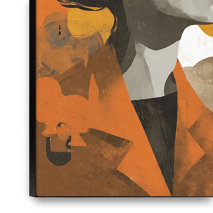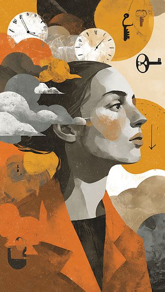 A surreal digital art portrait featuring floating keys and clocks in a calm, poetic composition. Modern flat editorial illustration style with bold flat colors, soft vintage grain texture, clean vector shapes, minimal shading, warm earthy palette, and abstract surrealism. Perfect for poster illustration and wall art lovers seeking…