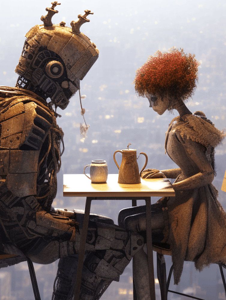 A fascinating duo sits at a small table, embedded in a natural, organic-looking structure of branches and roots that looks like a hiding place or a tree hollow. On the left sits a large, robust robotic figure, its surface reminiscent of rusted metal and old machines, crowned by branched horns. Its gaze is directed downwards. Opposite him sits a smaller figure with bright red, shaggy hair and a simple, earthy robe. She is also looking downwards, her hands resting on the table on which a teapot and cups are placed. A shadowy cityscape stretches out in the background at dusk or night, lending the scene a surreal and poetic depth.