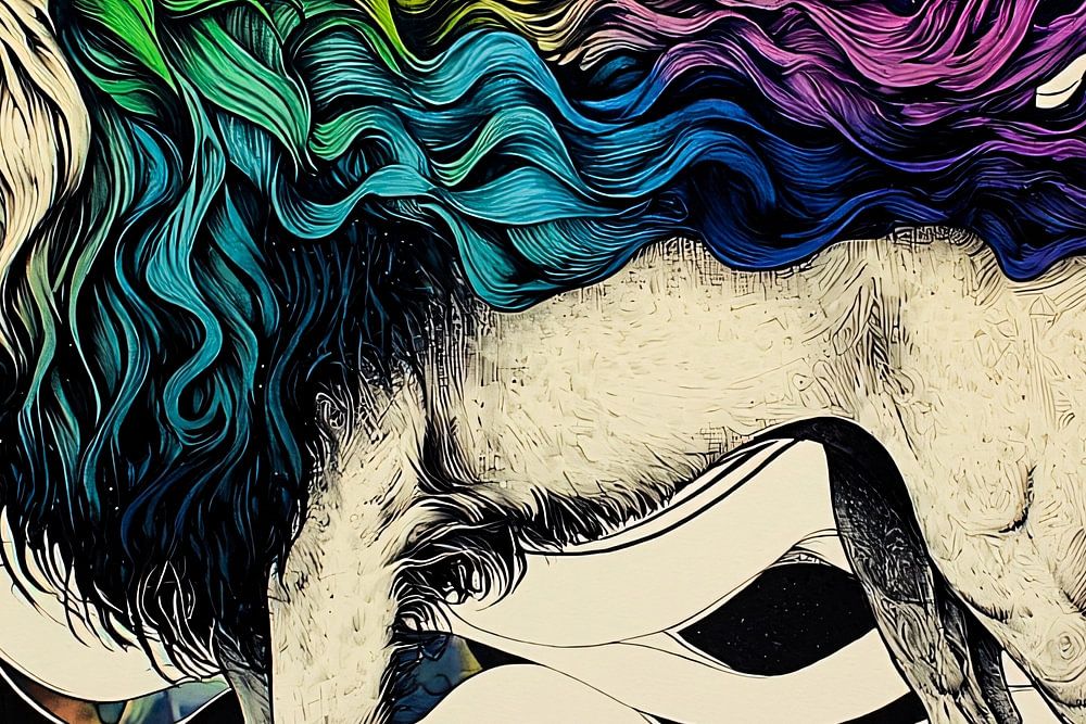 This design shows a beautiful surreal lion with a wavy, colourful mane spread in all shades of the rainbow. The background consists of flowing black and white lines, creating a dynamic contrast. The artwork is perfect for people who love eye-catching, modern decorations with a unique look. It adds a touch of colour and energy to any space and is particularly suitable for a living room or office. This creation appeals to lovers of animals, abstract art and colourful designs.