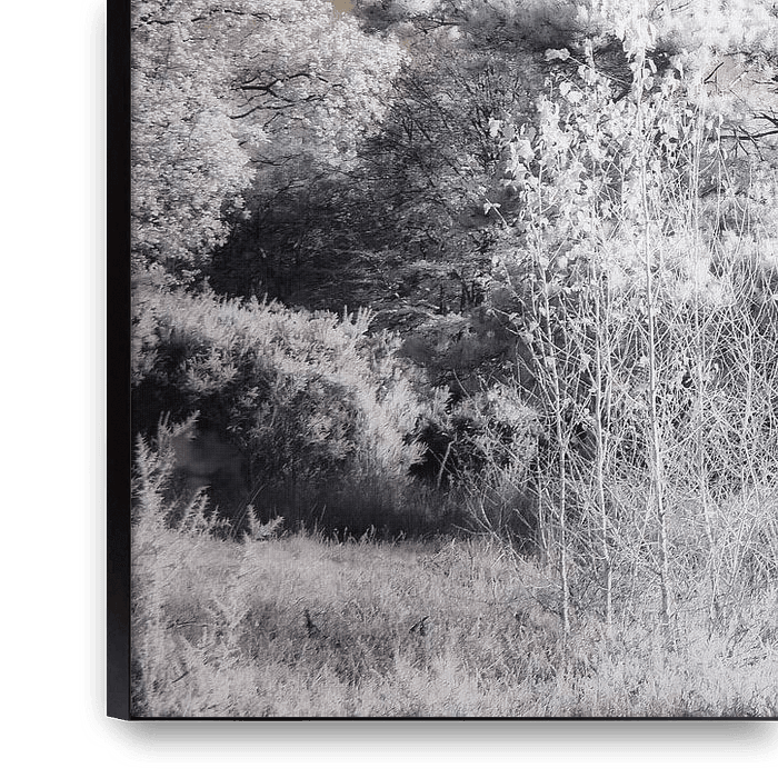 The works are created using infrared photography, a technique that captures light normally invisible to the human eye. As a result, familiar landscapes change subtly: trees take on a light, almost ethereal appearance, and skies become softer and more layered.