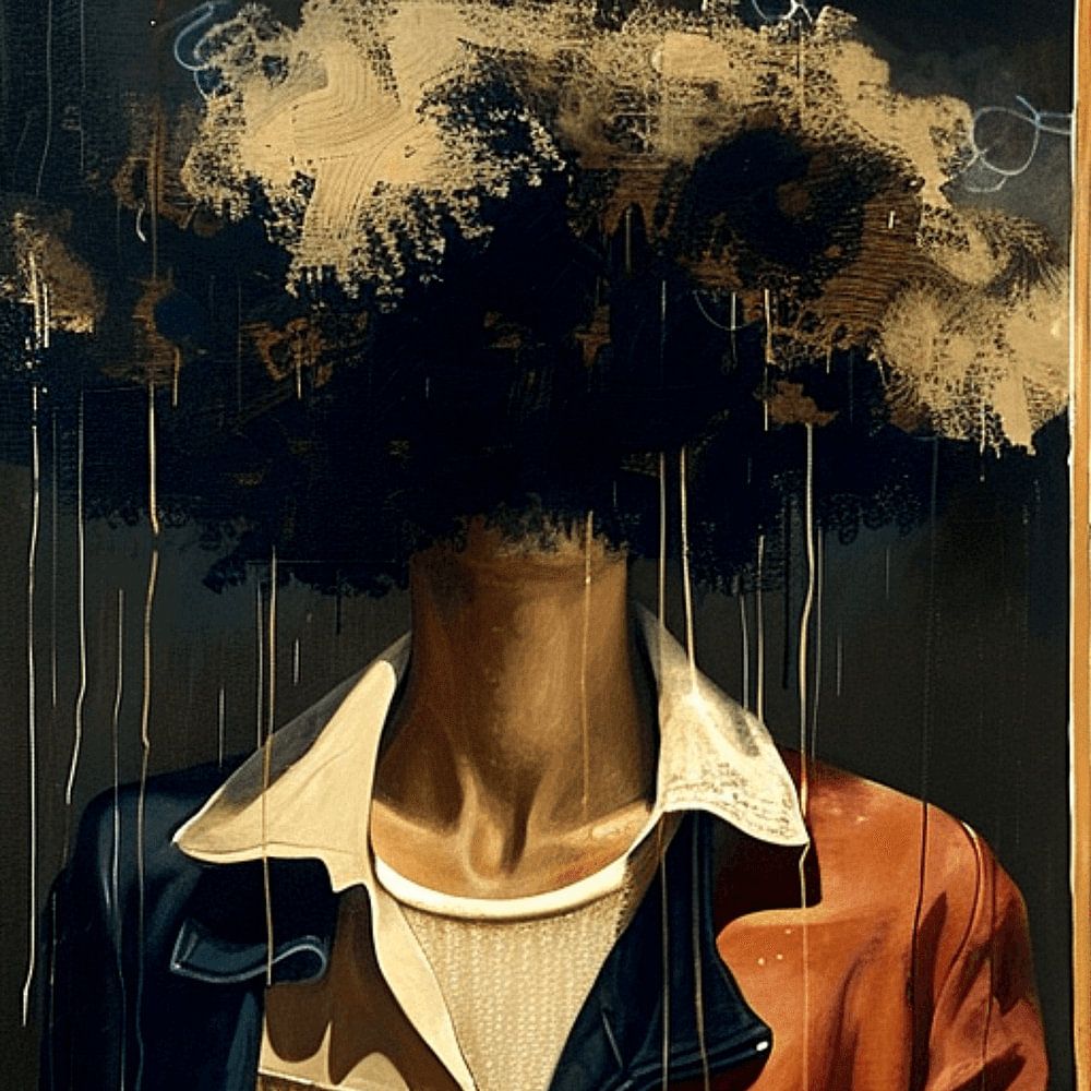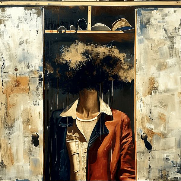 This fascinating composition combines elements of surrealist art with a touch of vintage aesthetic. A shapeless figure, clad in a striking two-tone jacket – one half deep black, the other warm orange – stands before a rustic, weathered cupboard. In place of a head rises a dense, dark cloud, interspersed with fine, dripping lines…
