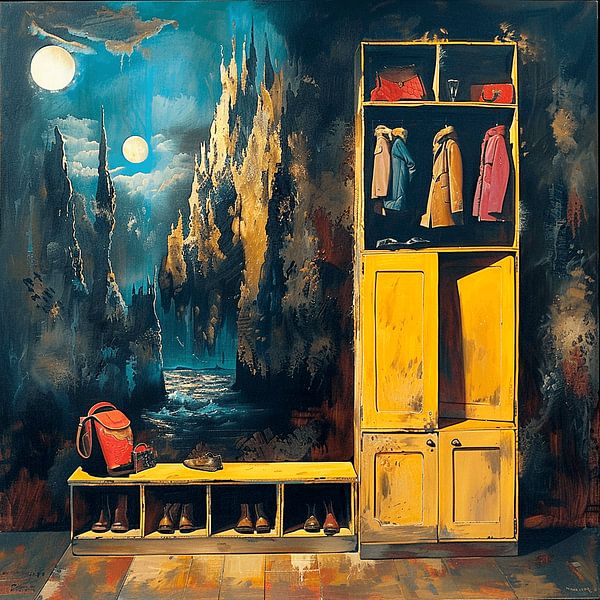 This captivating image captures a wondrous transition between a familiar cloakroom and a fantastical landscape. On the right stands a tall, weathered yellow cupboard, its doors and hooks laden with coats, bags and shoes – symbols of everyday life. The matching shoe bench neatly holds footwear at the ready. Immediately behind this scene,…