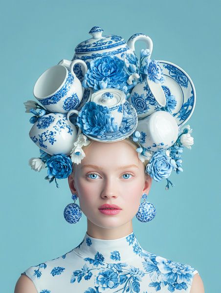 An elegant woman looks straight at you with a calm, almost serene gaze. Her face is soft and refined, whilst her head is crowned with a unique arrangement of Delft blue tableware and flowers. Teapots, cups and saucers come together to form a striking whole, as if fashion and art merge here into a single creative statement.