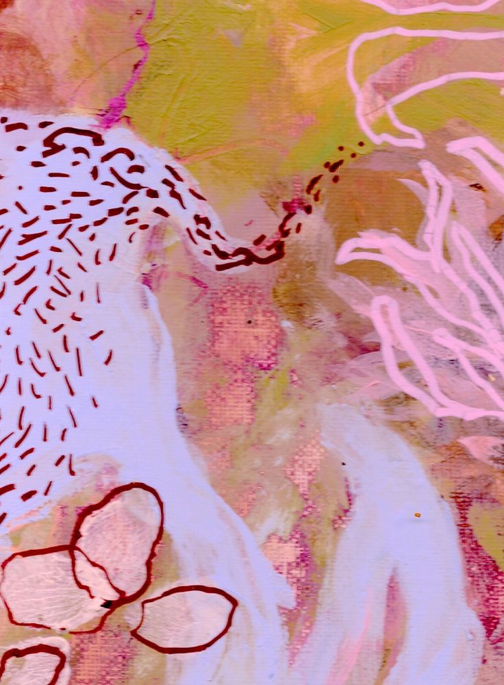 The title means ‘aquatic life’ in Japanese. It is a colourful, modern, abstract landscape depicting both above- and below-water scenes, with impressionistic and figurative touches. Do we see stones? Shells? Leaves? Seaweed? In the water? On the surface of the water? An eye-catching piece that invites you to lose yourself in daydreams…