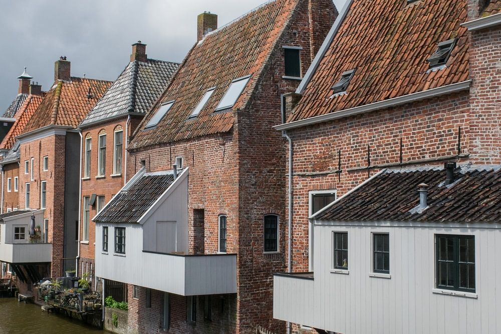 The famous hanging kitchens in picturesque Appingedam in the far north of the province Groningen. Here on a beautiful sunny day with big clouds in the background.