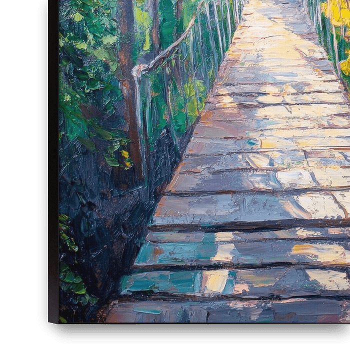 A mysterious wooden walkway meanders gently through the green thicket, surrounded by a radiant light that breaks through the canopy of leaves. The vibrant colours of nature unfold in a harmonious interplay of light and shadow, while the hanging ropes of the walkway are reminiscent of an adventure in the middle of this idyllic oasis.