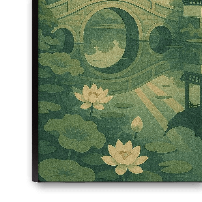 This artwork captures the poetic elegance of Suzhou, a city celebrated for its classical gardens, refined aesthetics, and centuries-old landscape design traditions. The scene showcases a peaceful garden pavilion set beside a calm lotus pond, where an arched stone bridge casts a perfect reflection across the still water. Rays of morning…