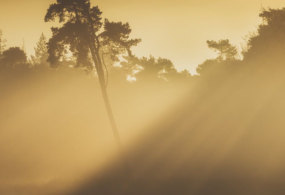 Beautiful sunbeams through the trees, a swan floating peacefully around. beautiful morning in the mastbos.