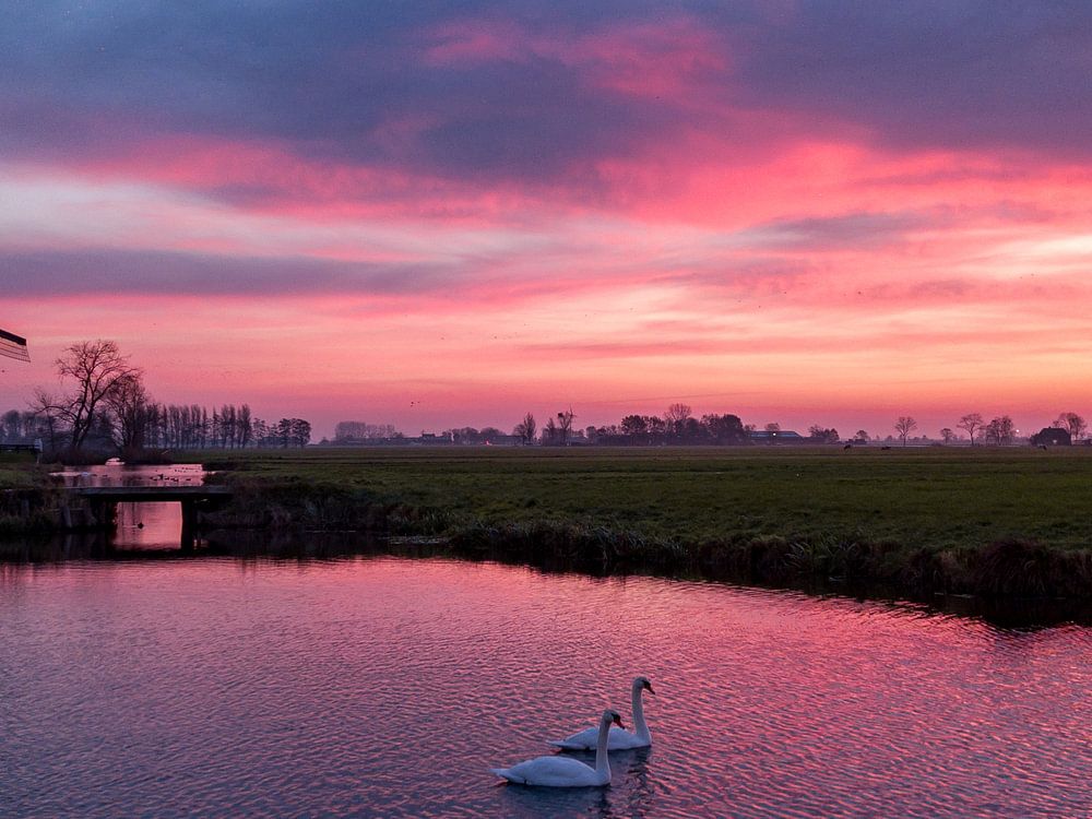 Everything comes together in this picture. The beautiful sunrise with the swans posing and in the background the Streefkerk windmill.