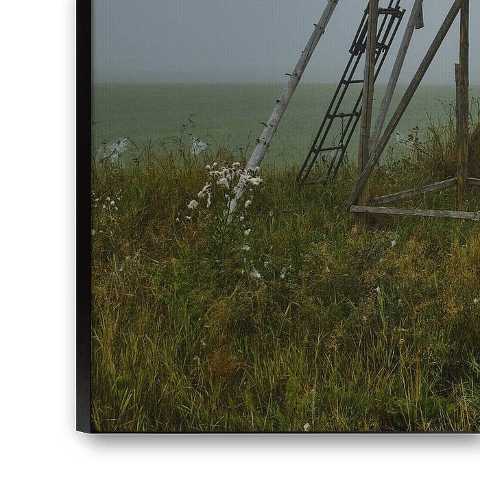 Swedish landscape in the fog with a hunting chair in the foreground and the autumn colours of the grass