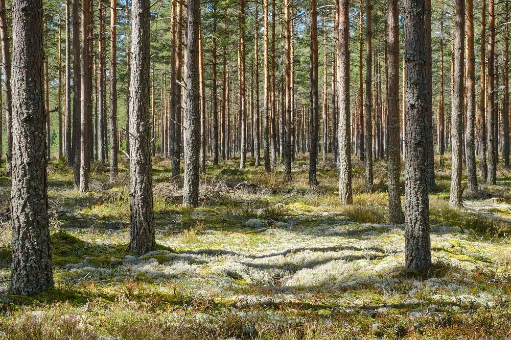 Swedish pine forest in autumn with moss and lingonberry bushes
